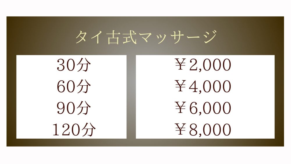 タイ古式マッサージは世界で一番気持ちいいマッサージと言われており、骨盤、股関節、仙腸関節、腰椎、胸椎などを矯正する動作があります。神経や血管、リンパ管の流れがよくなり、腰痛、神経痛、関節痛、生理不順、血行障害、むくみ、内臓の機能低下などの改善が期待できます。